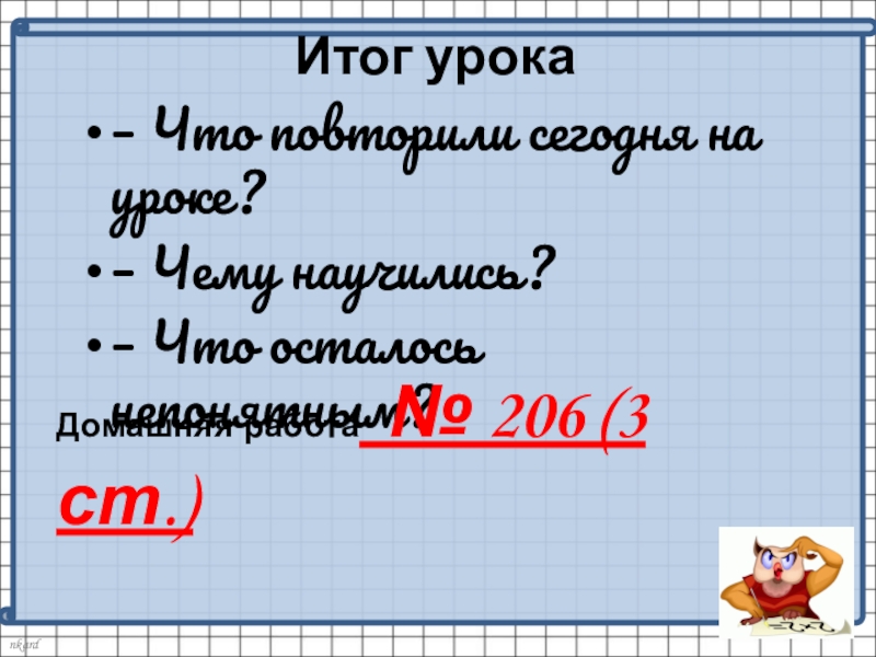 – Что повторили сегодня на уроке?– Чему научились?– Что осталось непонятным?Итог урокаДомашняя работа № 206 (3 ст.)