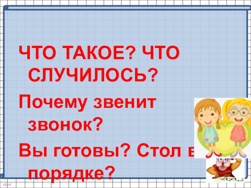 ЧТО ТАКОЕ? ЧТО СЛУЧИЛОСЬ?Почему звенит звонок?Вы готовы? Стол в порядке?Начинаем мы урок!