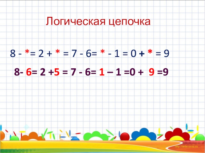 8- 6= 2 +5 = 7 - 6= 1 – 1 =0 + 9 =9 Логическая цепочка8 - *= 2 + * = 7 -