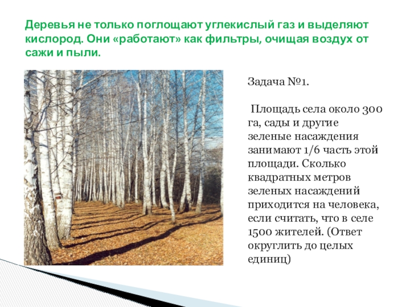 Площадь села около 300 га, сады и другие зеленые насаждения занимают 1/6 часть этой площади. Сколько квадратных метров зеленых насаждений приходится на человека, если считать, что в селе 1500 жителей. (Ответ округлить до целых единиц)