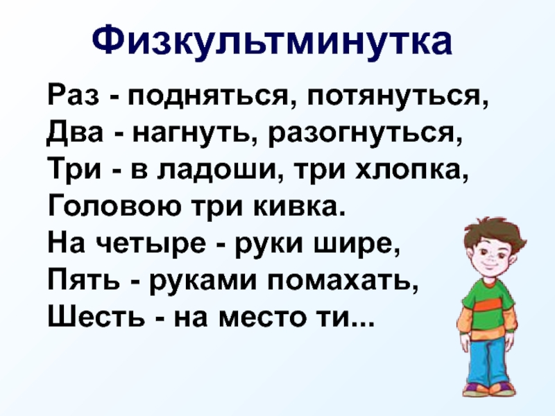 Слайд 9Раз - подняться, потянуться, Два - нагнуть, разогнуться, Три - в ладоши, три