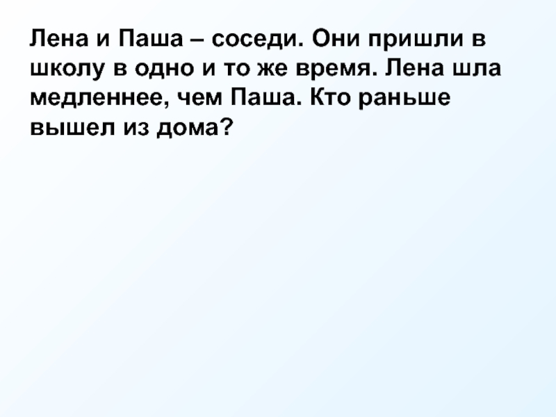 и то же время. Лена шла медленнее, чем Паша. Кто раньше вышел из дома?