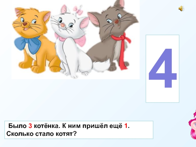 Слайд 4 Было 3 котёнка. К ним пришёл ещё 1.