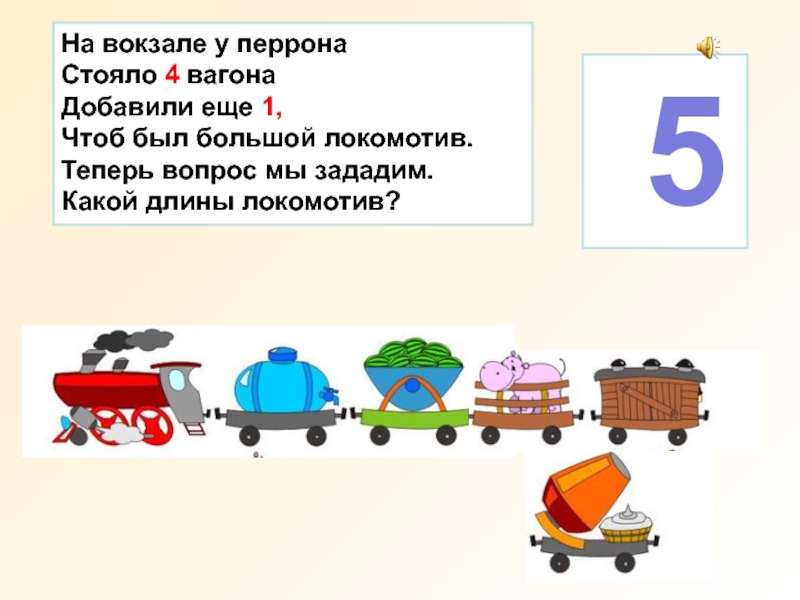 На вокзале у перрона Стояло 4 вагона Добавили еще 1, Чтоб был большой локомотив. Теперь вопрос мы