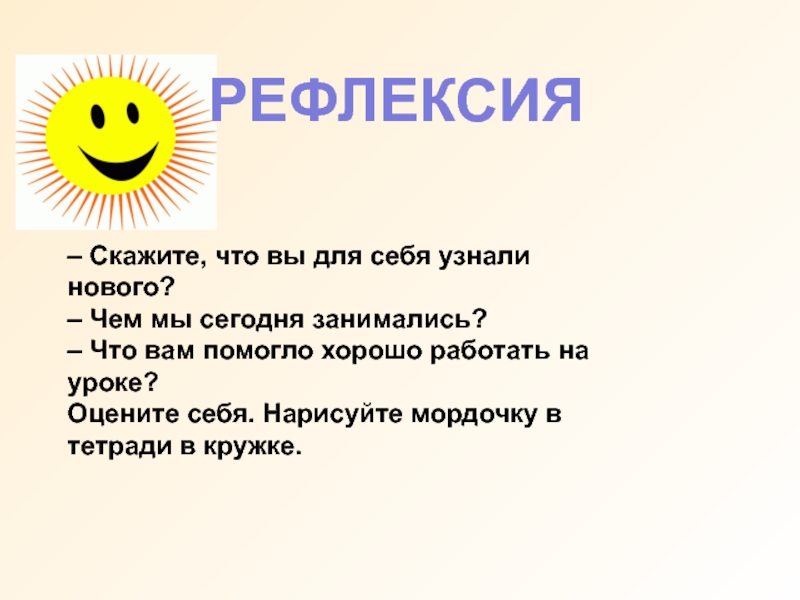 – Скажите, что вы для себя узнали нового?– Чем мы сегодня занимались?– Что вам помогло хорошо работать