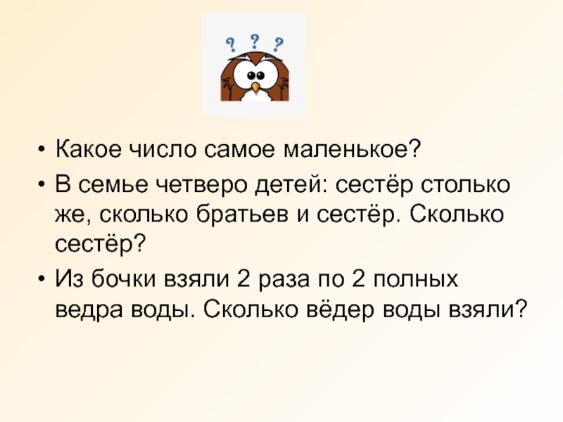 Какое число самое маленькое?В семье четверо детей: сестёр столько же, сколько братьев и сестёр. Сколько сестёр?Из бочки