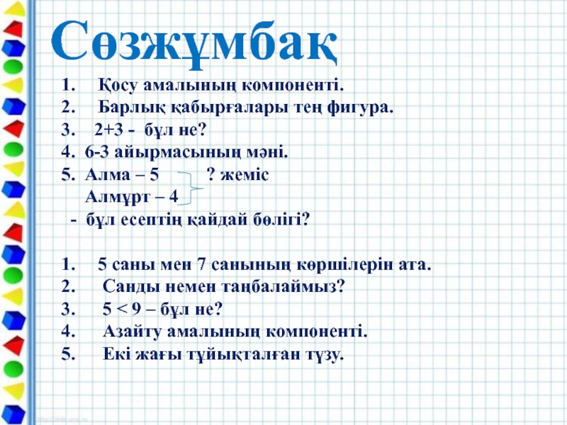 Сөзжұмбақ Қосу амалының компоненті.Барлық қабырғалары тең фигура.  2+3 - бұл не? 6-3 айырмасының мәні. Алма