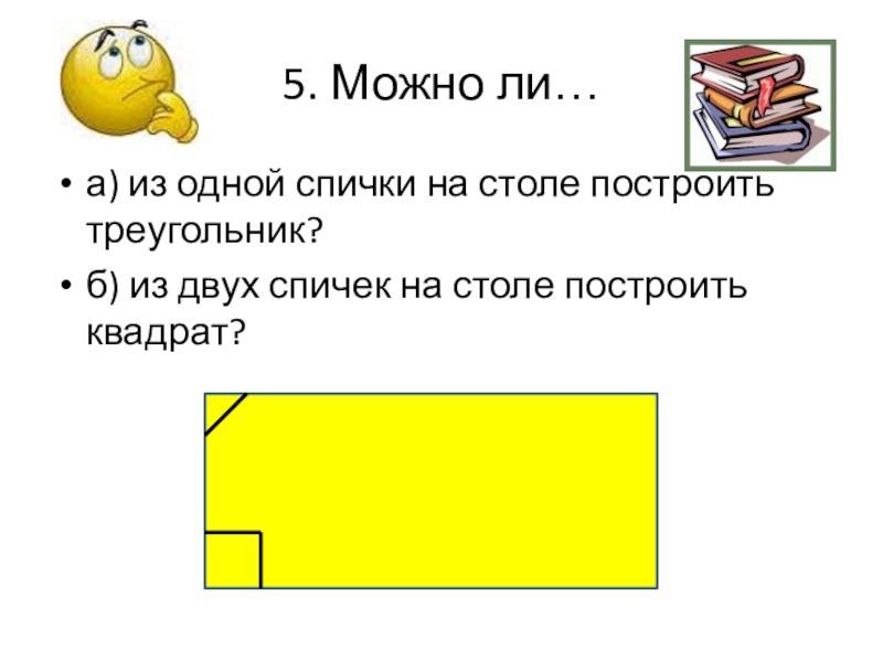 5. Можно ли…а) из одной спички на столе построить треугольник?б) из двух спичек на столе построить квадрат?