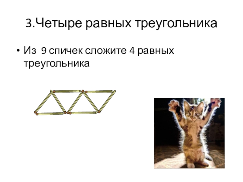 3.Четыре равных треугольникаИз 9 спичек сложите 4 равных треугольника