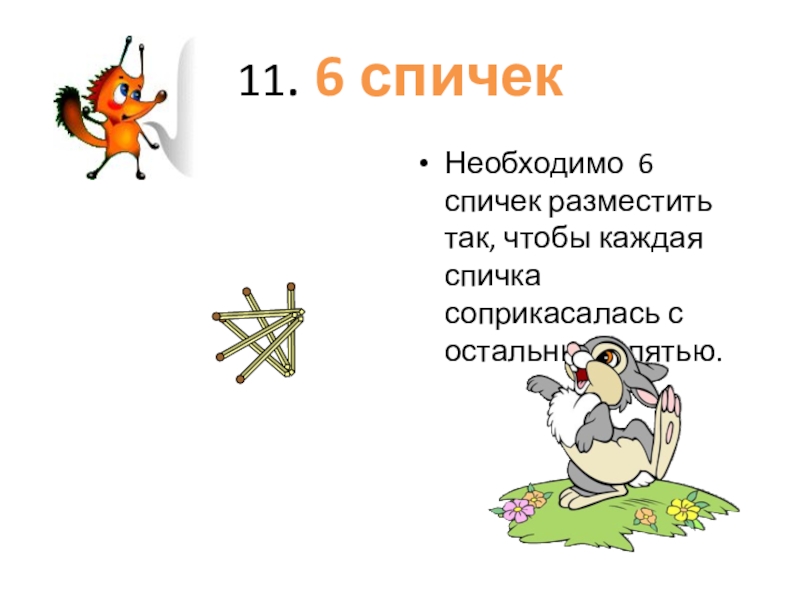 11. 6 спичекНеобходимо 6 спичек разместить так, чтобы каждая спичка соприкасалась с остальными пятью.