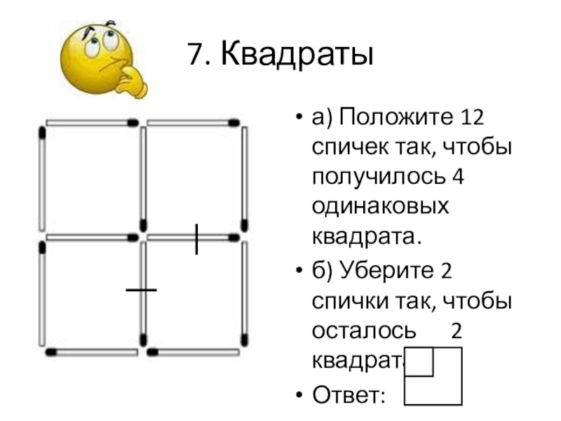 7. Квадратыа) Положите 12 спичек так, чтобы получилось 4 одинаковых квадрата.б) Уберите 2 спички так, чтобы осталось