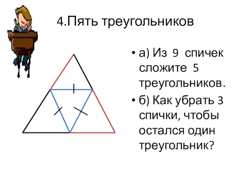 4.Пять треугольникова) Из 9 спичек сложите 5 треугольников.б) Как убрать 3 спички, чтобы остался один треугольник?