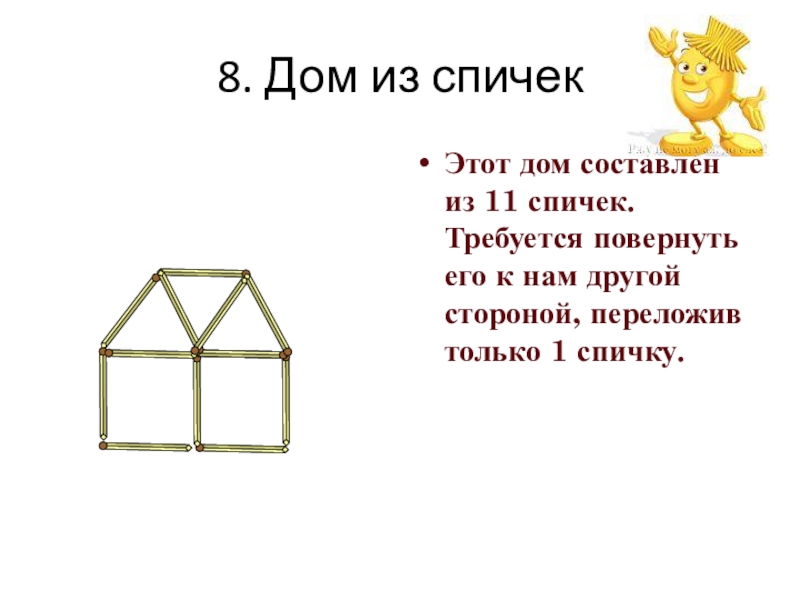 8. Дом из спичекЭтот дом составлен из 11 спичек. Требуется повернуть его к нам другой стороной, переложив