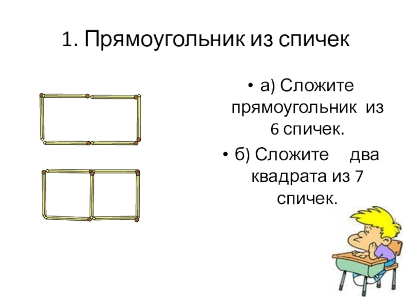 1. Прямоугольник из спичека) Сложите прямоугольник из 6 спичек.б) Сложите   два  квадрата из 7