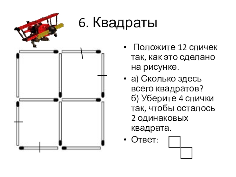 Сколько здесь всего квадратов? б) Уберите 4 спички так, чтобы осталось 2 одинаковых квадрата.