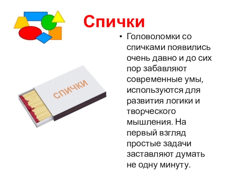 СпичкиГоловоломки со спичками появились очень давно и до сих пор забавляют современные умы, используются для развития логики и творческого мышления. На первый взгляд простые задачи заставляют думать не одну минуту.