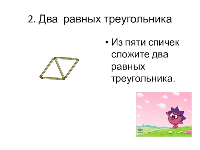 2. Два равных треугольникаИз пяти спичек сложите два равных треугольника.