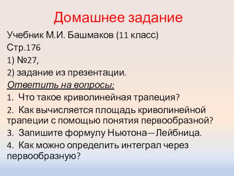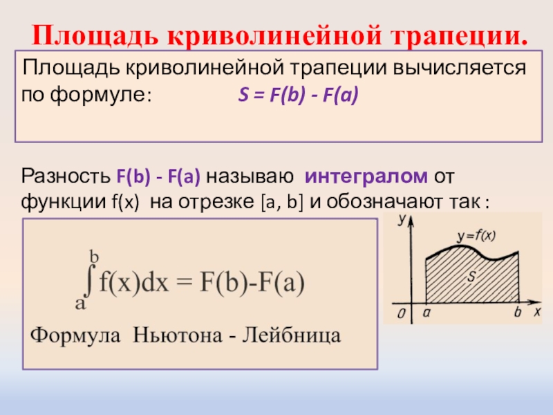 Разность F(b) - F(a) называю интегралом от функции f(x) на отрезке [a, b] и обозначают так :