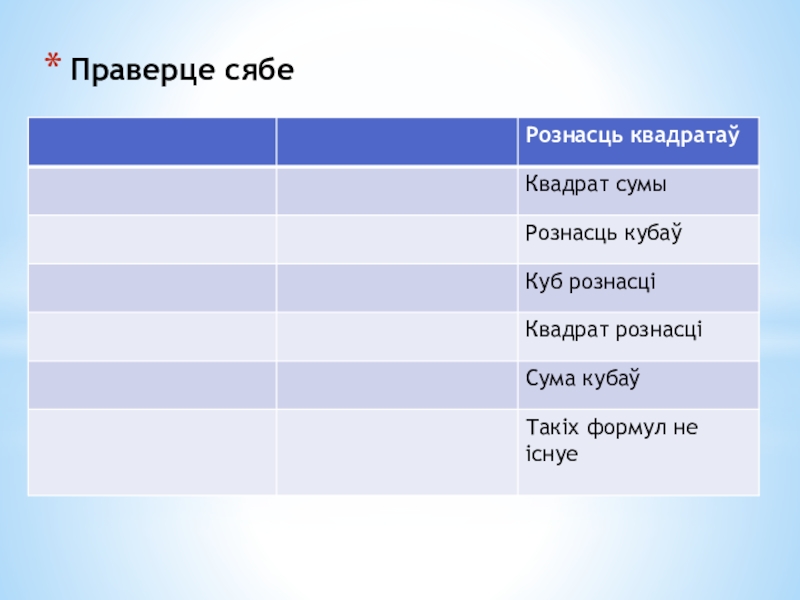 Тэма. Формулы скарочанага множання     Мэты. 1. Паўтарыць і сістэматызаваць веды,  умення і
