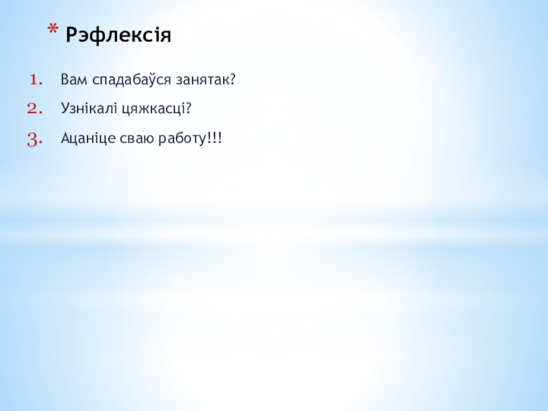 РэфлексіяВам спадабаўся занятак? Узнікалі цяжкасці?Ацаніце сваю работу!!!