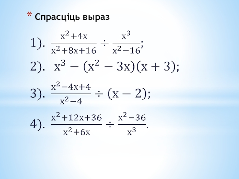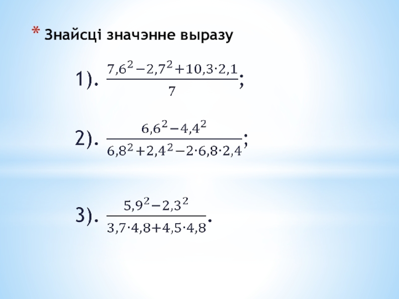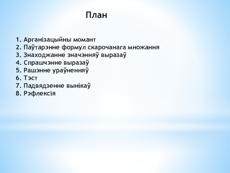 План 1. Арганізацыйны момант 2. Паўтарэнне формул скарочанага множання 3. Знаходжанне значэнняў выразаў 4. Спрашчэнне выразаў 5. Рашэнне ураўненняў 6. Тэст 7. Падвядзенне вынікаў 8. Рэфлексія