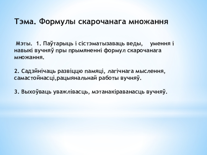 Слайд 2Тэма. Формулы скарочанага множання Мэты. 1. Паўтарыць і сістэматызаваць веды,