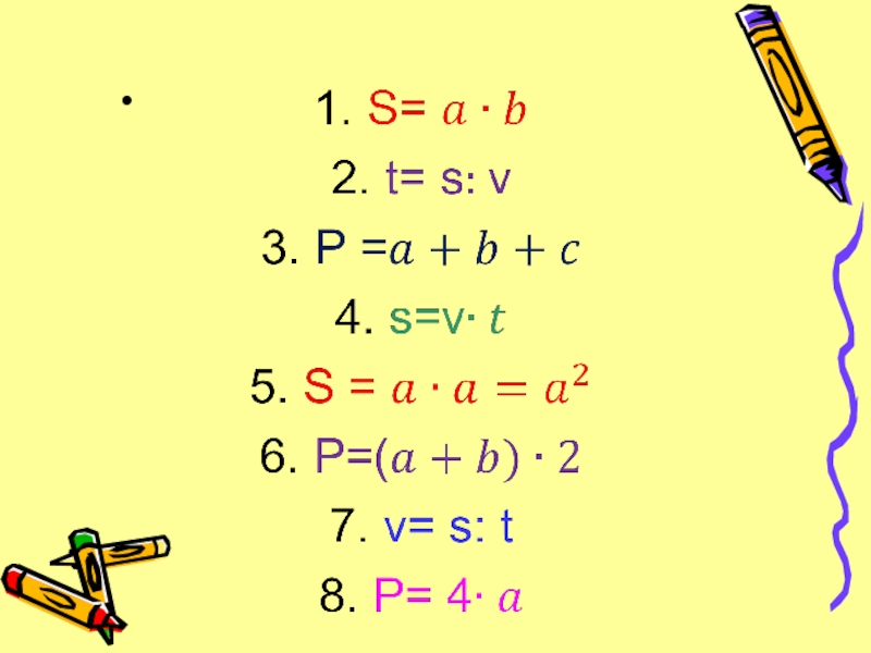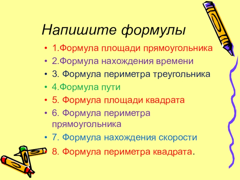 Напишите формулы1.Формула площади прямоугольника2.Формула нахождения времени3. Формула периметра треугольника4.Формула пути5. Формула площади квадрата6. Формула периметра прямоугольника7. Формула