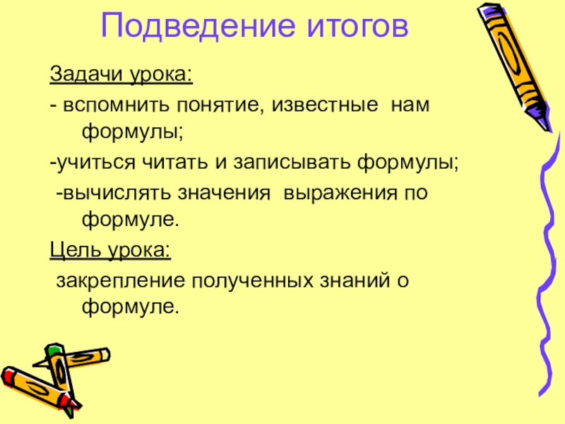 Подведение итогов Задачи урока:- вспомнить понятие, известные нам формулы;-учиться читать и записывать формулы; -вычислять значения выражения по