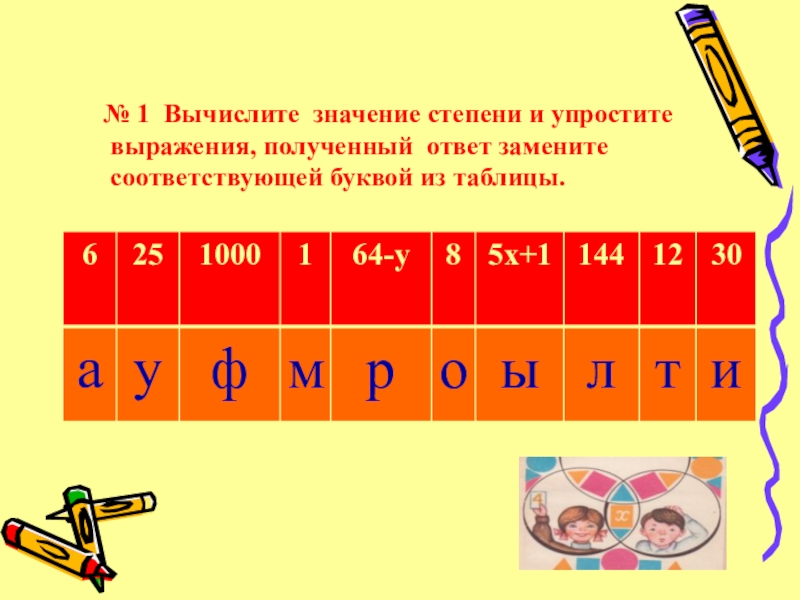 № 1 Вычислите значение степени и упростите выражения, полученный ответ замените соответствующей буквой из таблицы. Из полученных