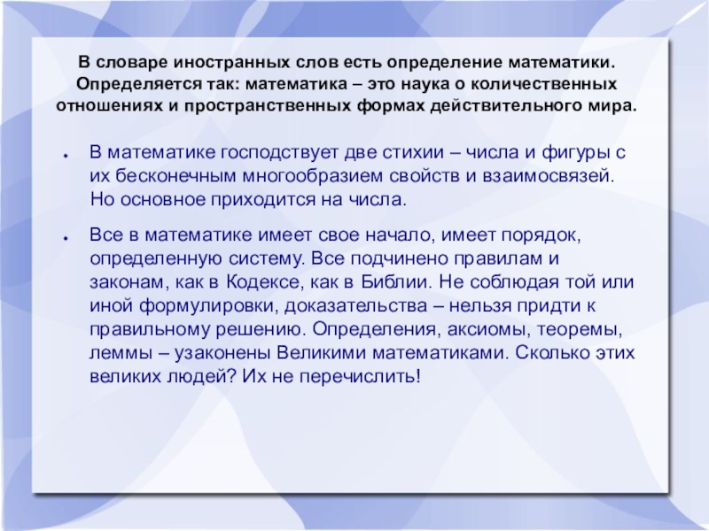 Слайд 3В словаре иностранных слов есть определение математики. Определяется так: математика –