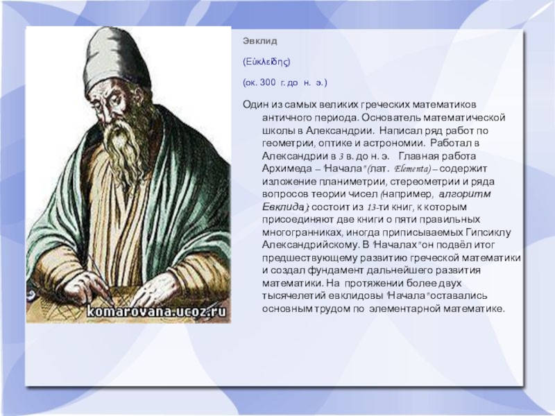 античного периода. Основатель математической школы в Александрии. Написал ряд работ по геометрии, оптике и астрономии. Работал в Александрии в 3 в. до н. э. Главная работа Архимеда – "Начала" (лат. Elementa) – содержит изложение планиметрии, стереометрии и ряда вопросов теории чисел (например, алгоритм Евклида); состоит из 13-ти книг, к которым присоединяют две книги о пяти правильных многогранниках, иногда приписываемых Гипсиклу Александрийскому. В "Началах" он подвёл итог предшествующему развитию греческой математики и создал фундамент дальнейшего развития математики. На протяжении более двух тысячелетий евклидовы "Начала" оставались основным трудом по элементарной математике.