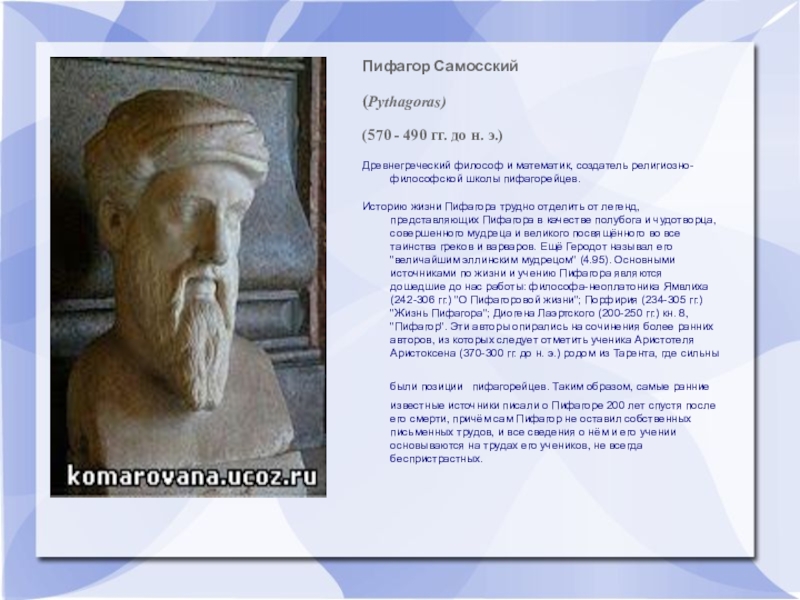 Историю жизни Пифагора трудно отделить от легенд, представляющих Пифагора в качестве полубога и чудотворца, совершенного мудреца и великого посвящённого во все таинства греков и варваров. Ещё Геродот называл его "величайшим эллинским мудрецом" (4.95). Основными источниками по жизни и учению Пифагора являются дошедшие до нас работы: философа-неоплатоника Ямвлиха (242-306 гг.) "О Пифагоровой жизни"; Порфирия (234-305 гг.) "Жизнь Пифагора"; Диогена Лаэртского (200-250 гг.) кн. 8, "Пифагор". Эти авторы опирались на сочинения более ранних авторов, из которых следует отметить ученика Аристотеля Аристоксена (370-300 гг. до н. э.) родом из Тарента, где сильны были позиции пифагорейцев. Таким образом, самые ранние известные источники писали о Пифагоре 200 лет спустя после его смерти, причём сам Пифагор не оставил собственных письменных трудов, и все сведения о нём и его учении основываются на трудах его учеников, не всегда беспристрастных.