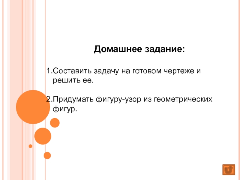 Домашнее задание:Составить задачу на готовом чертеже и решить ее.Придумать фигуру-узор из геометрических фигур.