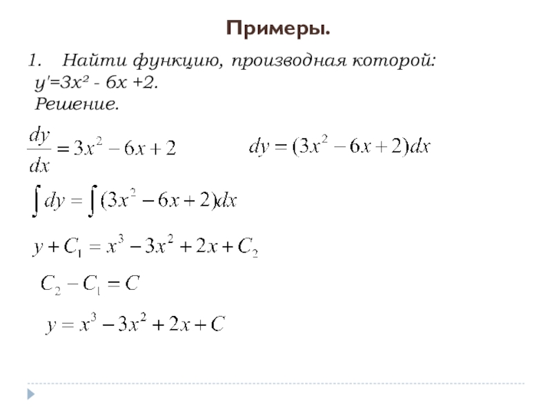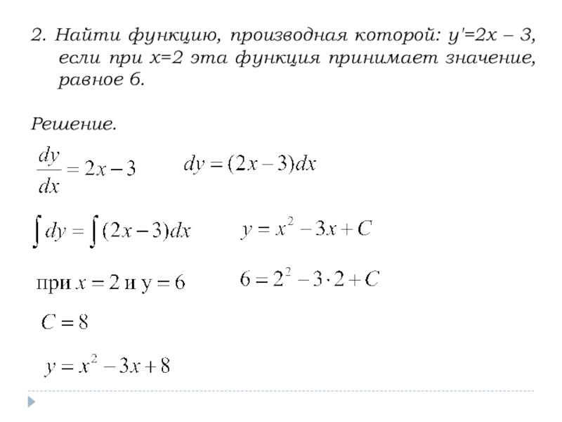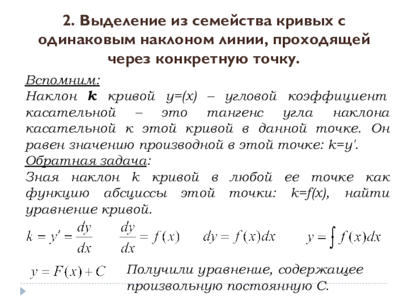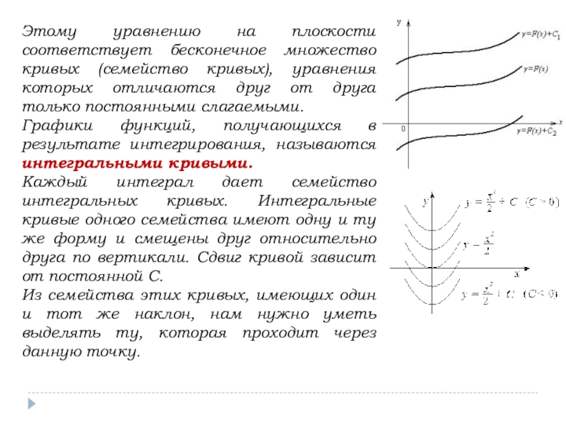 Мы нашли семейство кривых, для которых угловой коэффициент касательной в любой точке равен 2x. Эти кривые отличаются друг от друга на постоянное слагаемое С. При С=0 получим параболу y=x² с вершиной в начале координат, при С=1 – параболу y=x²+1 с вершиной в точке (0;1), при С=-2 – параболу y=x²-2 с вершиной в точке (0;-2) и т.д.