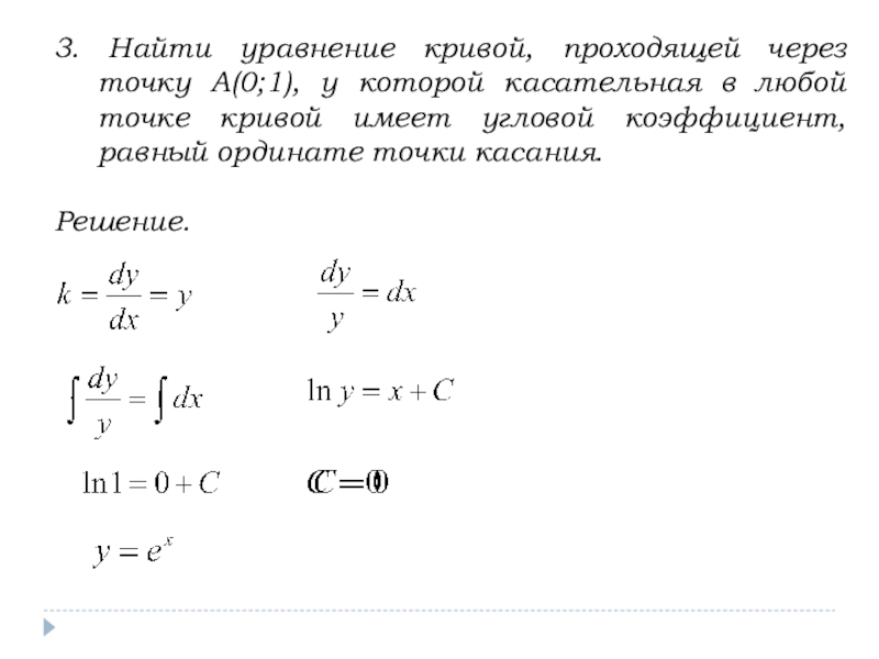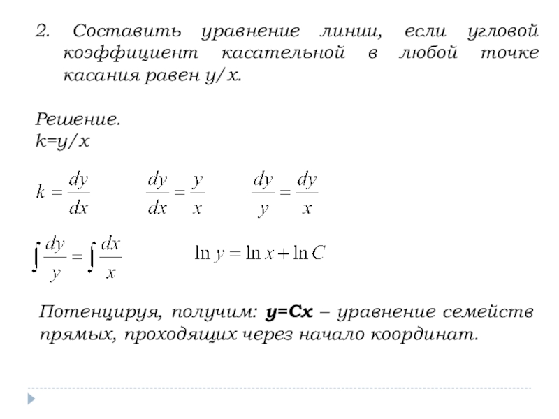 Потенцируя, получим: y=Cx – уравнение семейств прямых, проходящих через начало координат.