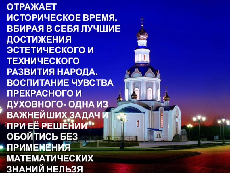 Слайд 23Храмовая архитектура отражает историческое время, вбирая в себя лучшие достижения эстетического