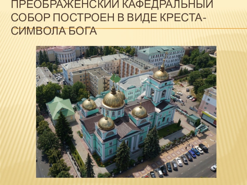 Слайд 15Преображенский кафедральный собор построен в виде креста-символа Бога