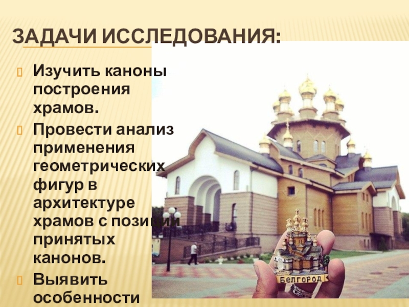 Задачи исследования:Изучить каноны построения храмов.Провести анализ применения геометрических фигур в архитектуре храмов с позиции принятых канонов.Выявить особенности
