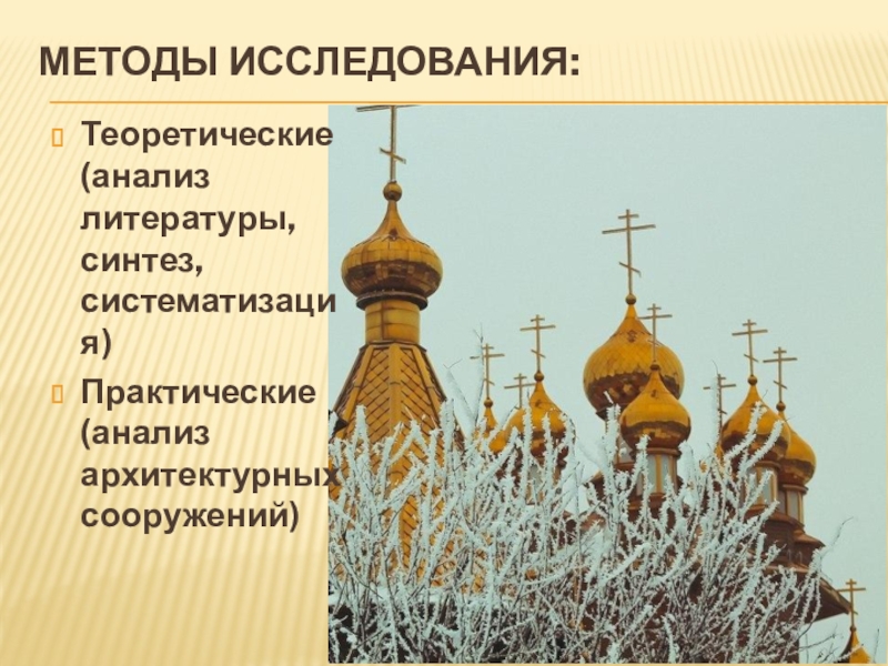 Методы исследования: Теоретические (анализ литературы, синтез, систематизация)Практические (анализ архитектурных сооружений)