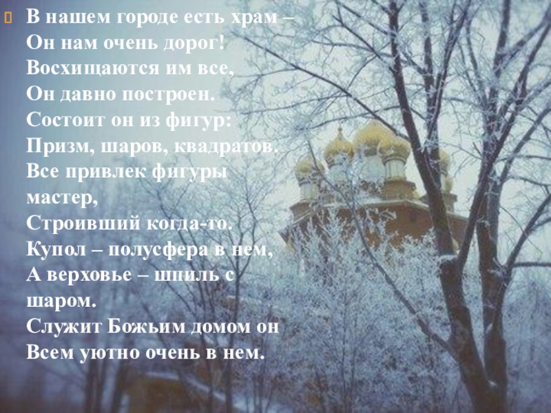 все, Он давно построен. Состоит он из фигур: Призм, шаров, квадратов. Все привлек фигуры мастер, Строивший когда-то. Купол – полусфера в нем, А верховье – шпиль с шаром. Служит Божьим домом он Всем уютно очень в нем.