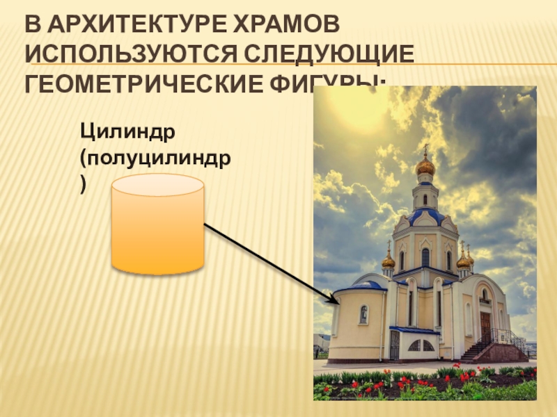 В архитектуре храмов используются следующие геометрические фигуры:Цилиндр (полуцилиндр)