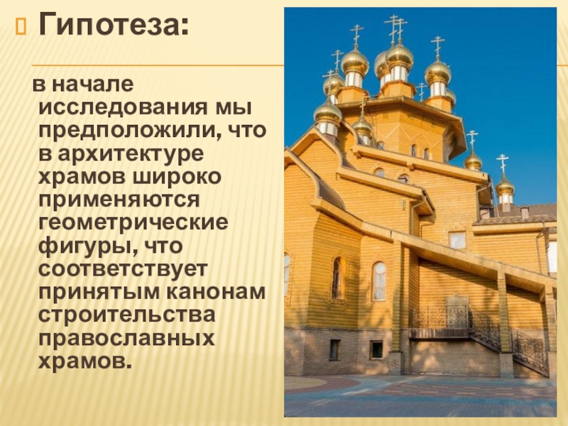 Гипотеза:    в начале исследования мы предположили, что в архитектуре храмов широко применяются геометрические фигуры,