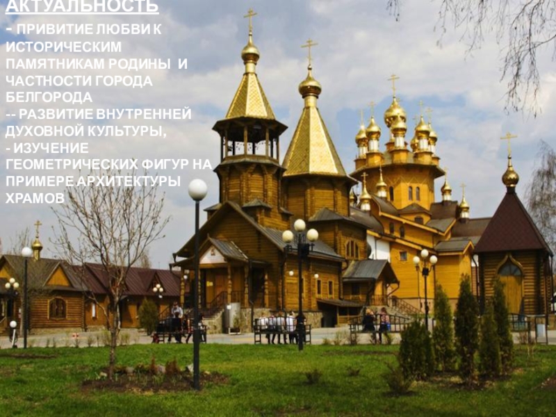 Актуальность - Привитие любви к историческим памятникам Родины и частности города Белгорода -- развитие внутренней духовной культуры, - Изучение геометрических фигур на примере архитектуры храмов