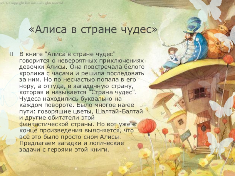 невероятных приключениях девочки Алисы. Она повстречала белого кролика с часами и решила последовать за ним. Но по несчастью попала в его нору, а оттуда, в загадочную страну, которая и называется "Страна чудес". Чудеса находились буквально на каждом повороте. Было многое на её пути: говорящие цветы, Шалтай-Балтай и другие обитатели этой фантастической страны. Но вот уже в конце произведения выясняется, что всё это было просто сном Алисы.