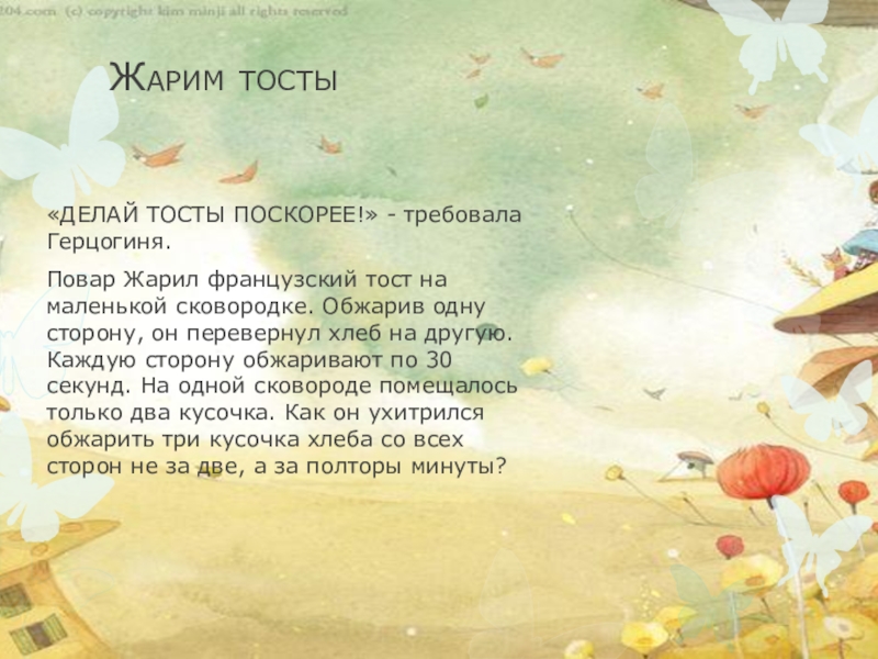 маленькой сковородке. Обжарив одну сторону, он перевернул хлеб на другую. Каждую сторону обжаривают по 30 секунд. На одной сковороде помещалось только два кусочка. Как он ухитрился обжарить три кусочка хлеба со всех сторон не за две, а за полторы минуты?