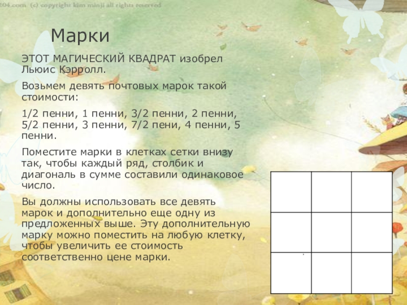 Поместите марки в клетках сетки внизу так, чтобы каждый ряд, столбик и диагональ в сумме составили одинаковое число.