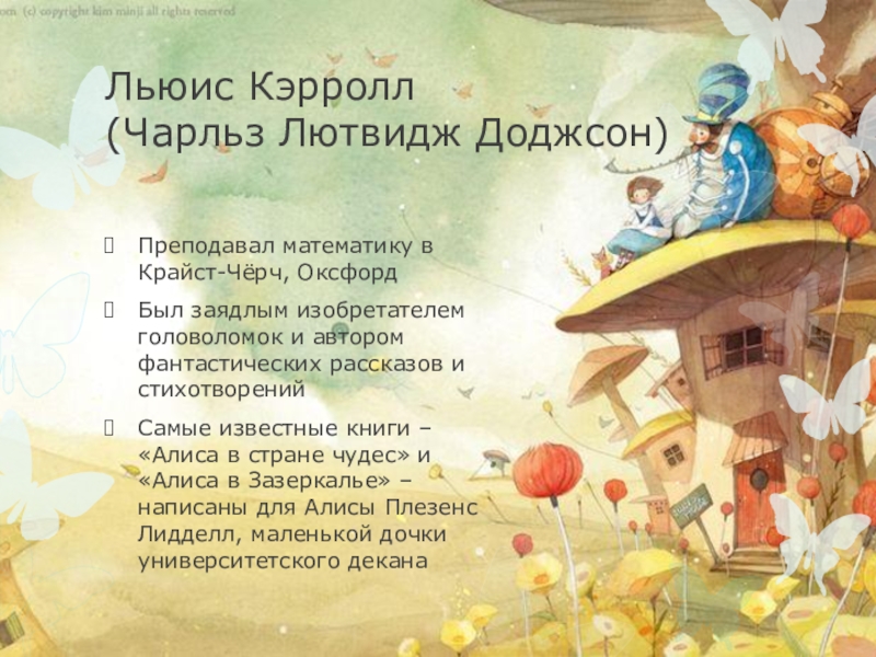 Самые известные книги – «Алиса в стране чудес» и «Алиса в Зазеркалье» – написаны для Алисы Плезенс Лидделл, маленькой дочки университетского декана