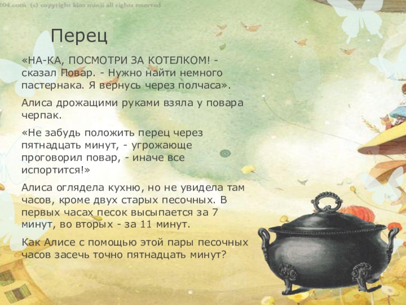 Как Алисе с помощью этой пары песочных часов засечь точно пятнадцать минут?