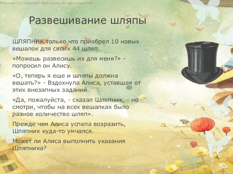 «Да, пожалуйста, - сказал Шляпник, - но смотри, чтобы на всех вешалках было разное количество шляп».