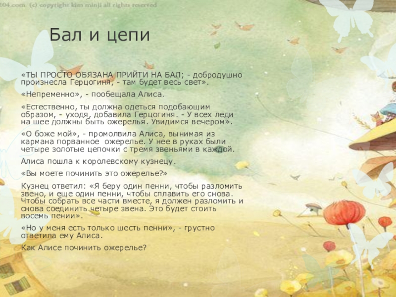 «О боже мой», - промолвила Алиса, вынимая из кармана порванное ожерелье. У нее в руках были четыре золотые цепочки с тремя звеньями в каждой.